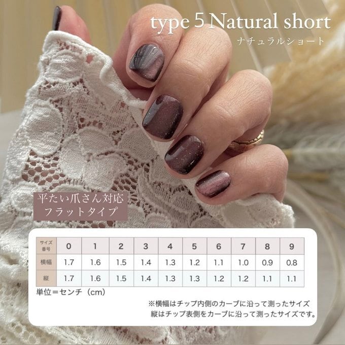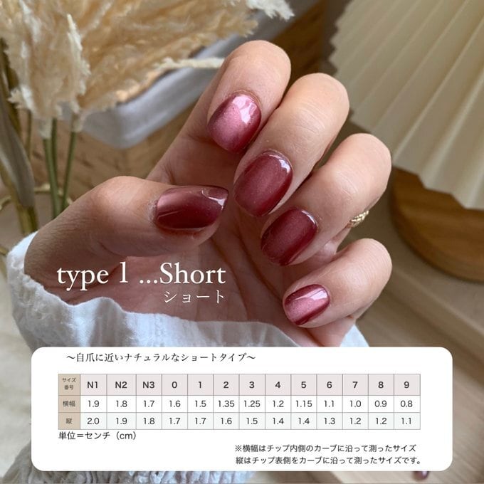 1.ショート・・・・当店で取り扱うチップの中で一番短めのベリーショートサイズです。快適な装着感で生活しやすく、普段使いに最適♫大〜極小までの全13サイズございますので爪が小さめな方でもオススメです。先端は自然なカーブのある形です。